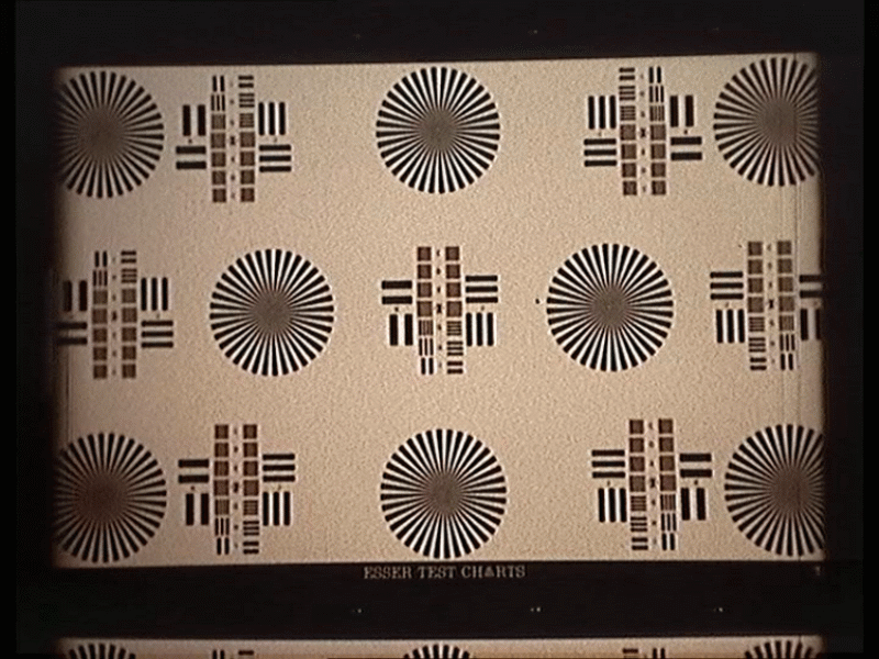 1. Vorschau Filmbild einer alten 70er Jahre Super 8 Filmkopie ( 16 mm Film - Kontaktkopie) zur Darstellung der verzerrungsfreien MUVIG - Bildfeldeinjustierung vor der Testüberspielung 2007 2. Vorschau - Filmbild der 1. Szene Testfilm 2007 mit deutlich sichtbarem, die Ästhetik des Bildfeldes eingrenzenden, Span. 3. Testtafel der 4. Szene (Schärfetest) der Testfilmes 2007, schief geliefert und damit das Bildfeld des 1. Bildes zusätzlich einschränkend, da für die Abtastung der gesamte Film umjustiert werden musste, um die 2 Testtafeln (Szene 4 und 5) bestmöglich abtasten (Einzelbildfolgen herstellen und Videostream digitalisieren) zu können. 4. 2. Szene des Testfilmes 2005 zum Vergleich der Schärfebewertung 2005 und 2007. |