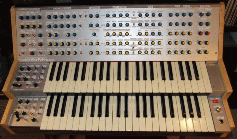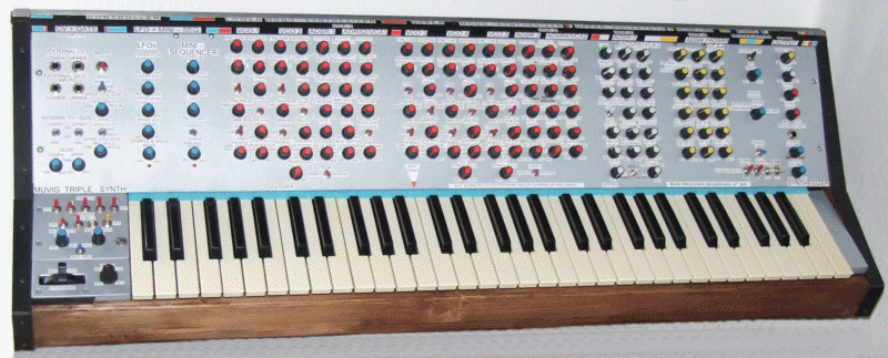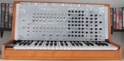 MUVIGSYNTH 1: Als 19" Rackmodul im Jahr 2011 hergestellt und im Jahr 2012 durch Keyboard - Controller und Zusatzbaugruppen ergänzt. Ein sehr kompakter Synthesizer mit 2 VCO, 4 ADSR, 4 VCF, 4 LFO und 2 Ringmodulatoren. Stimmstabil nach 20 Minuten über Thermostat und Klimaschaltung. 32 x 6,3 mm Klinkenbuchsen am Modulausgang ermöglichen Einbindung in andere Synthesizer. Besteht aus 3 separaten Einzelsynthies, 2 x mit 12 dB Multimode - Filtern und 1 x mit 24 dB Tiefpass - Filter, die über einen Mixer an ein weiteres 12 dB VCF und einen VCA mit ADSR gelangen. Der Klang ist außergewöhnlich. Das Gerät ist nach musikalischen Gesichtspunkten entwickelt worden. Die durchdachte Verteilung von nur 2 VCO und Sub - VCOs auf 3 Teilsynthies macht das Instrument sehr vielseitig. Die Tastatur ist hochwertig. Als Staubschutz wurde eine Plexiglashaube hergestellt. |