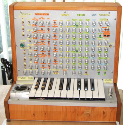 MUVIGSYNTH 5: Dieser analoge Synthesizer wurde 2014 entwickelt und hergestellt. Das Gerät wurde übersichtlich und mit hochwertigen Komponenten ausgestattet. Die Seitenteile sind aus 40 Jahre gelagertem Hartholz gefertigt worden und die Tastatur wird Pianisten gerecht. Es handelt sich um einen monophonen Synthesizer, der auch duophon spielbar ist. Besonderes Augenmerk wurde auf die musikalisch sinnvollen und interessanten Modulationsmöglichkeiten der 4 VCO gelegt. So erhielt jeder VCO einen separaten ADSR zur Frequenzmodulation, was natürlichen Einschwingvorgängen anderer Instrumente gerecht wird. Zusätzlich zum MASTER - VIBRATO kann jeder VCO mit einem separaten LFO moduliert werden, oder mit dem zugeordneten ADSR. 2 x 24 dB Tiefpass Filter und 2 x VCA werden von weiteren 4 x ADSR gesteuert. Weitere Modulationsmöglichkeiten sind vorhanden und leicht umzusetzen. |