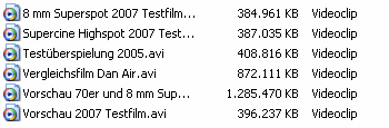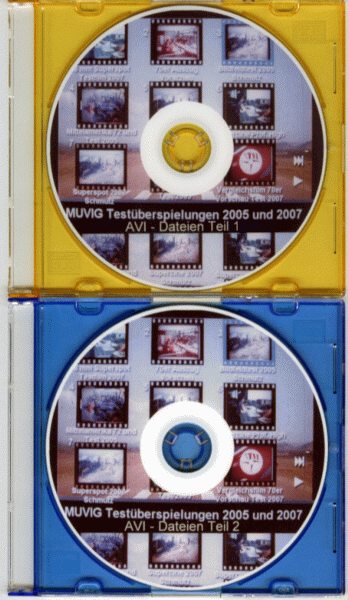 Für den Test 2005, bei dem die Fa. MUVIG mit der Gesamtnote 1,8 als "Preis - Leistungssieger" hervorging, wurde damals eine PAL- DVD mit Videodateien und DVD- Textmenü geliefert. Die nachträgliche Auswertung einer Archivkopie dieser DVD ermöglichte jedoch keine professionelle Einzelbildanwahl der Klebestellen. Erst die AVI- Datei dieser Testüberspielung gestattete es, jedes damals überspielte Einzelbild anzuwählen und zu dokumentieren. Die Klebestellen von 2005 waren nach Auswertung des Tests ebenso wichtig geworden, wie die Ursachenermittlung über das Nachdunkeln, bzw. die Farbveränderung der 1. ESSER- Testtafel gegenüber der Bilddarstellung in der Zeitschrift "schmalfilm", Heft 2/2005, Seite 55*. Die Farbveränderung der letzten ESSER- Farbtafel- Digitalisierung bei MUVIG gegenüber dem abgedruckten Foto vom "Abfilmen dieser Tafel" im Heft2/2005 der Zeitschrift "schmalfilm" auf Seite 54* war ebenfalls Gegenstand einer näheren Laboranalyse. Um es vorweg zu nehmen: "komprimierte DVD - Video Dateien sind ungeeignet, um einen wissenschaftlichen Nachweis über die Qualität einer Schmalfilmüberspielung zu liefern, da Einzelbilder einfach verschluckt werden". An dieser Aussage gibt es nach den Labortests der Fa. MUVIG vom Juli und August 2007 keinen Zweifel mehr. Es war lediglich dem glücklichen Umstand zu verdanken, dass MUVIG seit 10 Jahren mit DV- Recordern arbeitet und wichtige Überspielungen auch auf Mini- DV- Kassetten digitalisierte. Das geschah auch beim Test 2005 und 2007 und war die einzige Möglichkeit, an die entscheidenden Einzelbilder von Klebestellen und identische Bilder mehrerer Abtastungen des selben Mediums heranzukommen. Die Grundlage unterschiedlicher bei Astromuvig dargestellter Laboranalysen waren insgesamt 10 AVI- Dateien, die auf 2 Daten DVD- ROM gespeichert wurden: |