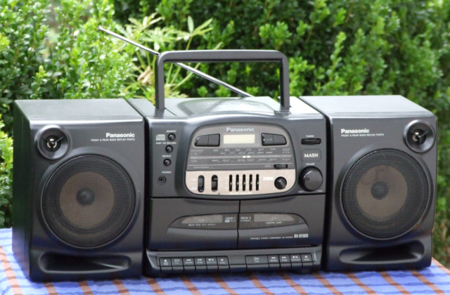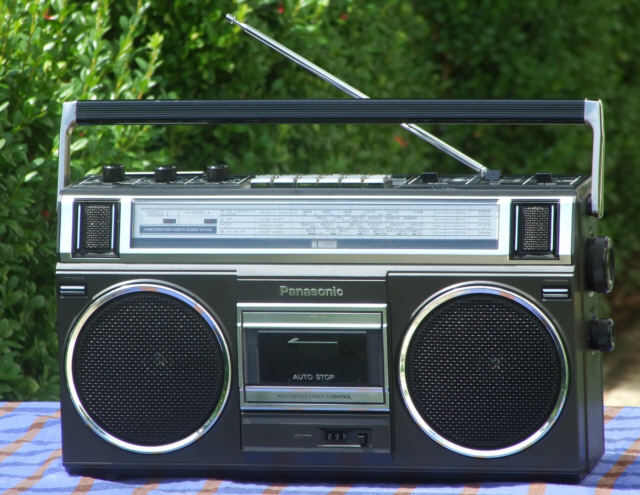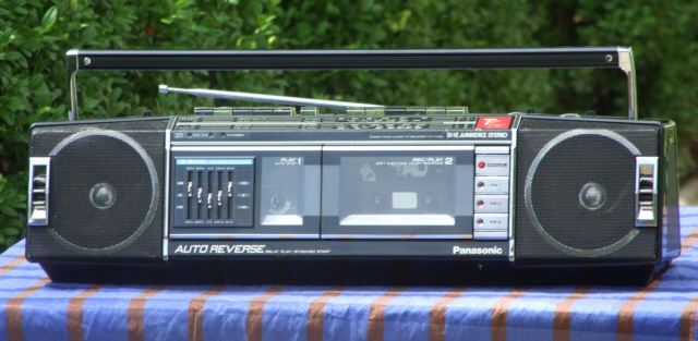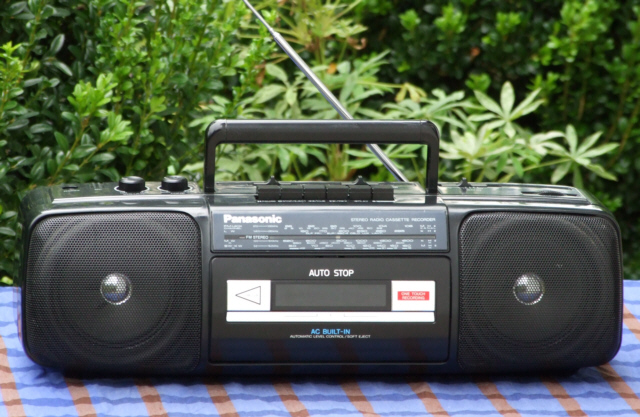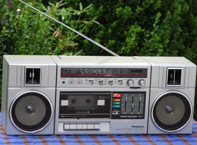 Panasonic Ghettoblaster aus den 1980er Jahren in sehr gutem Zustand. Lediglich im Bereich der 3 Drehpotis gibt es leichte Verformungen durch eine Wärmequelle. Im Jahr 2018 würde ein solches Gerät neu 250 Euro kosten